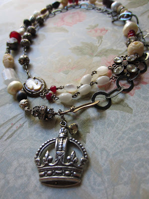 Of course I had to thrown in a sterling silver crown for good measure. This double-wrap necklace features lots of freshwater pearls and gemstones, and a length of oxidized sterling chain. A victorian cameo adds a bit of whimsy.